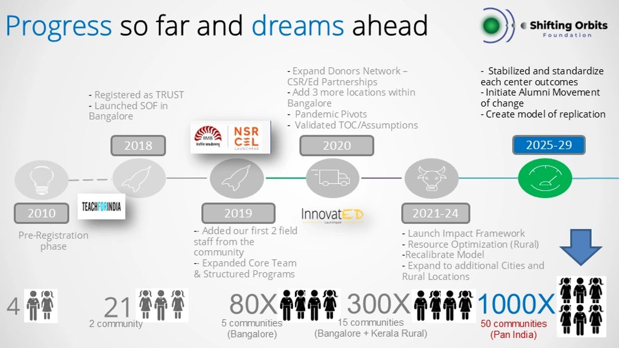 Now in Year 6 - We are covering 550+ families across 15+ communities through our 9 Centres in Bangalore, Coimbatore and Kerala (Rural). Hopefully our "satellite centers" staffed with our own alumni/teachers from the community will soon start playing the role of "force-multipliers" and uplift the 250-200 households in each of the communities we touch!